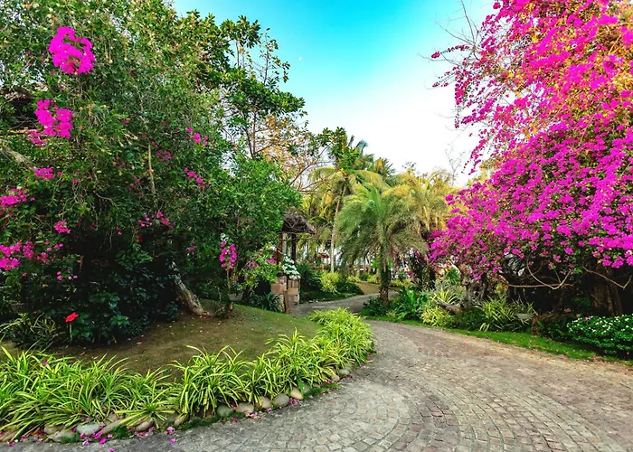 The hotel is surrounded by a garden, and a white beach is also nearby.